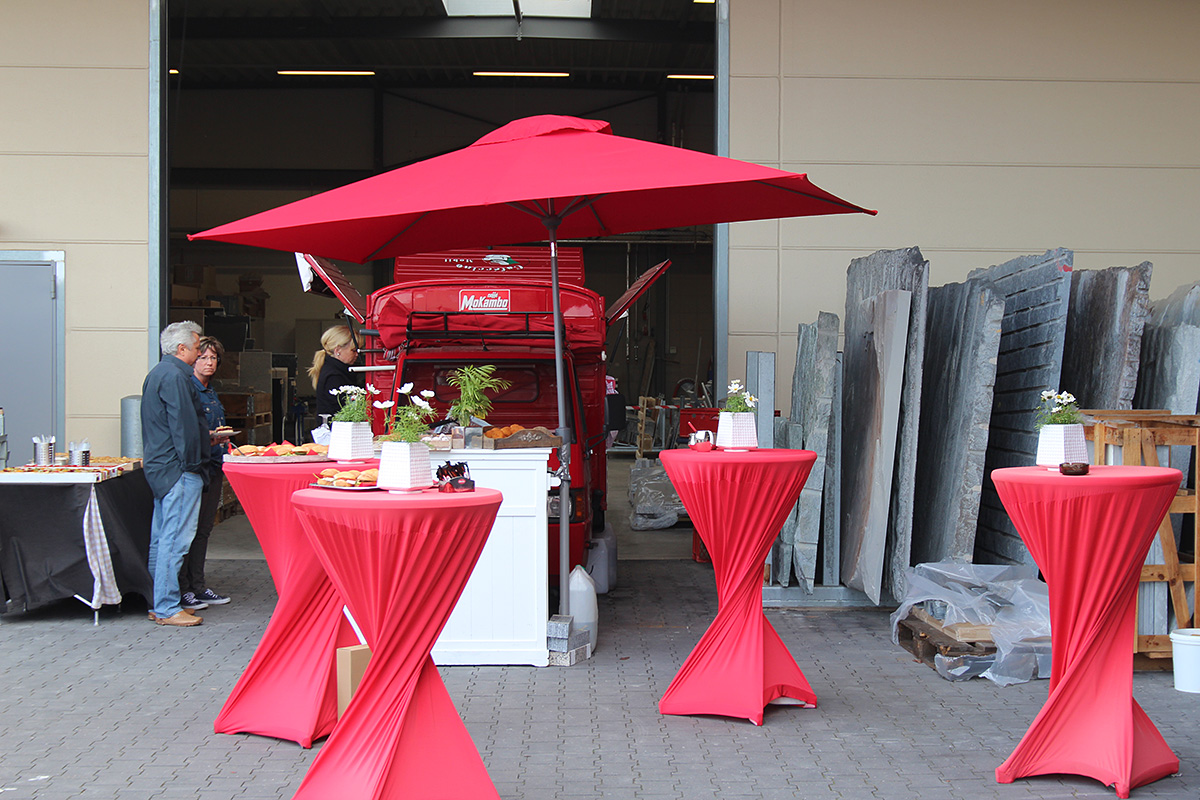 Pünktlich um 9.00 Uhr startete das "Stein.Fliesen.Fest 2015" der Firma "Mietz Natursteine & Fliesen GmbH". Für Geschäftspartner, Handwerker, Architekten, Bauherrn, Bauträger und allen an Stein Interessierten bot sich die einmalige Möglichkeit, Steine aus aller Welt auf knapp 5.000 qm Ausstellungs- und Lagerfläche zu erkunden. Die Liste der tonnenschweren Exponate umfasste über 200 Arten von Hart- und Weichgesteinen. Granite, Gabbros, Basalte, Gneise, Quarzite waren genauso zu bewundern wie zahlreiche Marmore, Kalksteine, Sandsteine, Travertine und Schiefersteine. Heimische Natursteine wie beispielsweise der beliebte "Deutsche Jura" waren natürlich genauso wie der exklusive Granit aus Brasilien vor Ort vertreten.