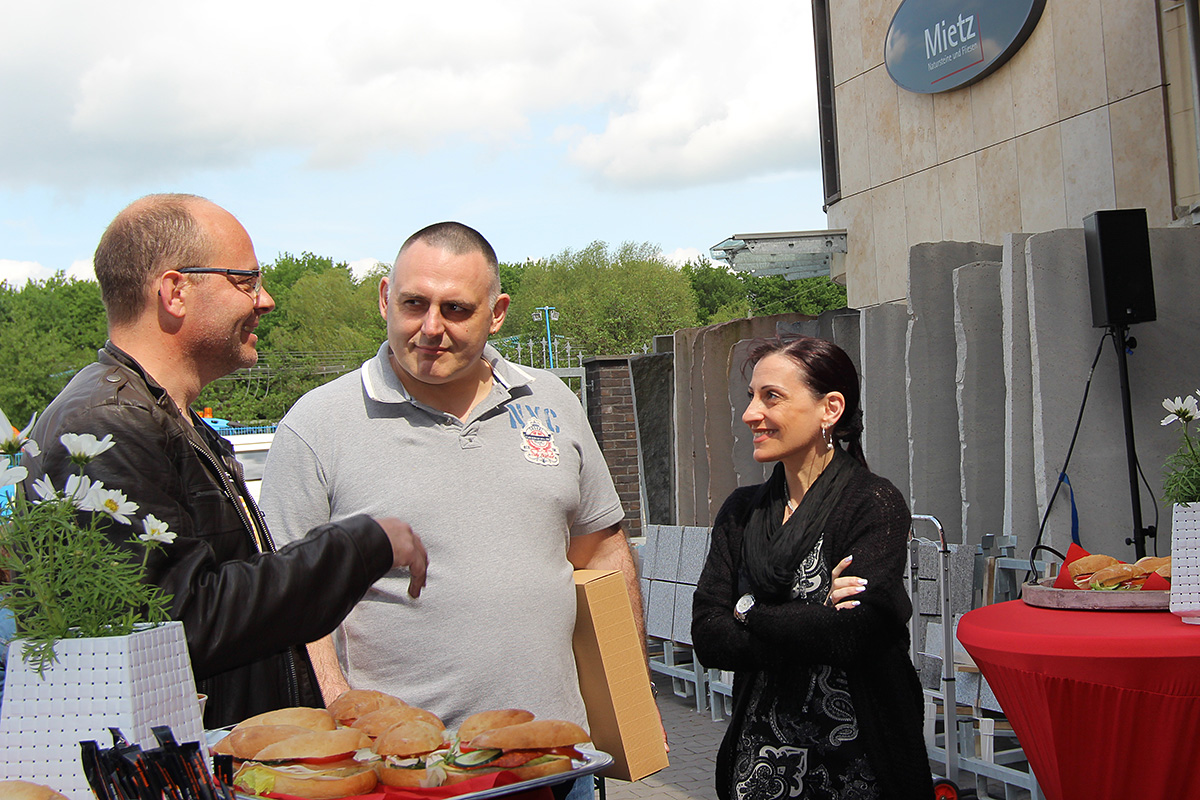 Geschäftsführer Hagen Mietz hatte an alles gedacht. Zahlreiche Live-Vorführungen von Verlegearbeiten bis hin zur Herstellung eines Mosaiks begeisterten die Gäste. Da wurde gefachsimpelt, geklönt und so mancher Kniff ausgetauscht. Getränke und kulinarische Spezialitäten rundeten das Programm ab.
