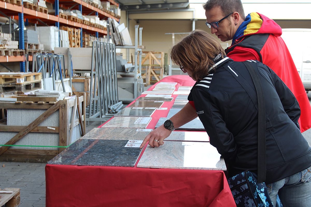 Äußerst beliebt war natürlich der Schnäppchen-Markt. Hier wechselten mal eben ein paar Tonnen Natursteine und Fliesen den Besitzer, denn Handwerker und Natursteinexperten aus der Region nutzen die Gunst der Stunde und deckten sich ein. Auch für den Privatmann gab es zumindest im Fliesenbereich interessante Angebote, für die auch mal der Platz im Kofferraum reichte.